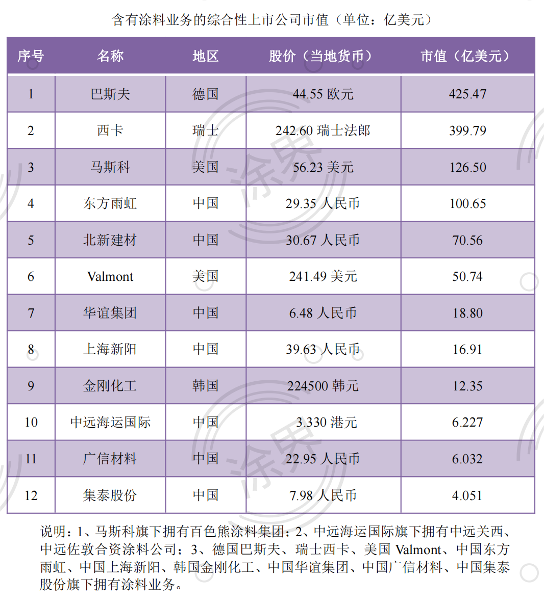 此外,含有涂料业务的综合性公司并没有纳入榜单,其中:德国巴斯夫市值为425.47亿美元,瑞士西卡市值为399.79亿美元,美国百色熊母公司马斯科市值为126.50亿美元,中国东方雨虹市值为100.65亿美元等。(涂界)