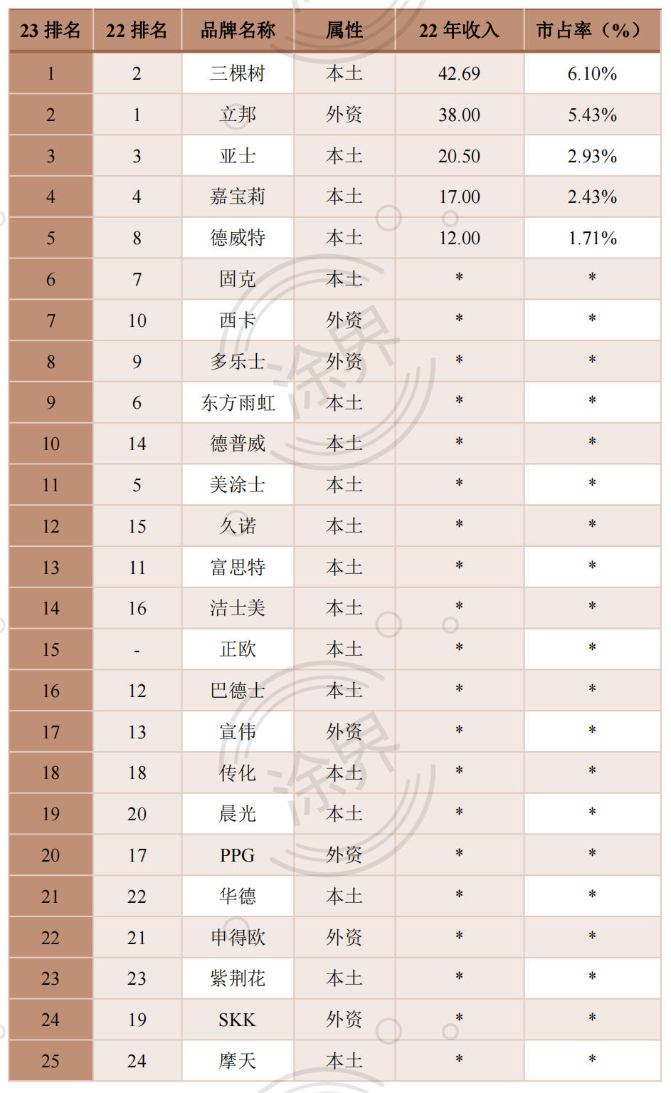 9月15日,为了让业界了解工程建筑涂料市场发展状况,国内涂料行业专业财经媒体《涂界》发布“2023中国工程建筑涂料品牌TOP 25”。该榜单根据企业2022年工程建筑涂料业务销售收入进行排名,这是《涂界》连续第六年发布该榜单,今年榜单入围门槛为2.30亿元。