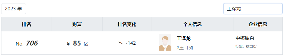 中核钛白王泽龙以85亿元财富排名榜单第706位,财富缩水25亿元,排名下降142位。