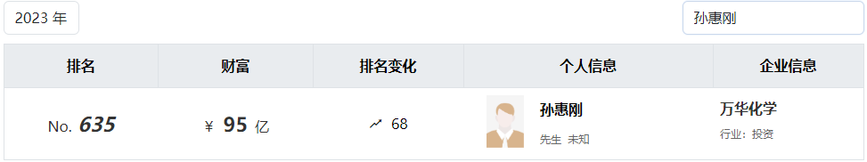 万华化学孙惠刚以95亿元财富排名榜单第635位,财富增长5亿元,排名上升68位。