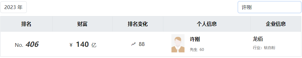 龙佰许刚以140亿元财富排名榜单第406位,财富增加15亿元,排名上升88位。
