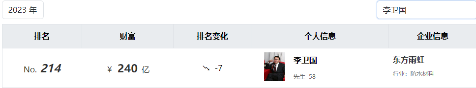 东方雨虹董事长李卫国以240亿元财富排名榜单第214位,虽然财富缩水15亿元,排名下滑7位,但依然成为防水首富。
