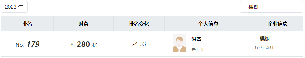 10月24日,2023胡润百富榜发布。三棵树董事长洪杰,以280亿元的财富,蝉联涂料行业首富,排名比去年又上升了33位。
