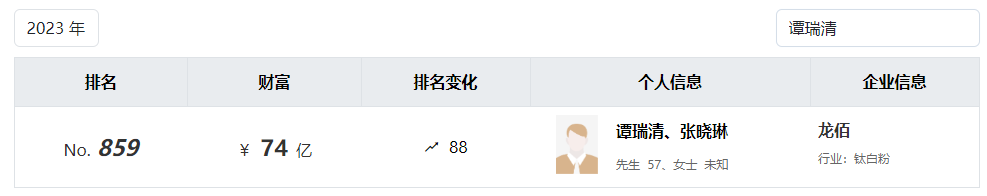 龙蟒佰利联谭瑞清、张晓琳夫妇以74亿元财富排名榜单第859位,财富增长5亿,排名上升88位。