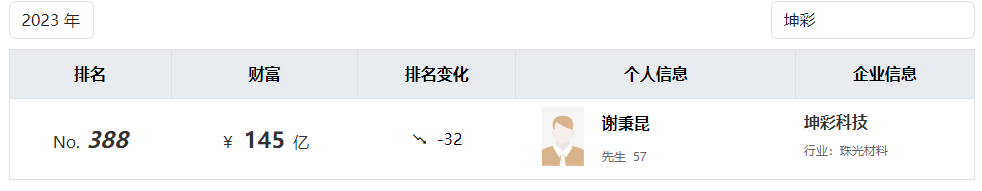 坤彩科技董事长谢秉昆家族以145亿元财富排名榜单第388位,财富缩水20亿元,排名下降32位。