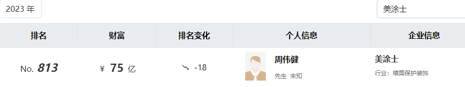 美涂士董事长周伟建以75亿元财富排名第813位,财富缩水5亿元,排名下降18位。