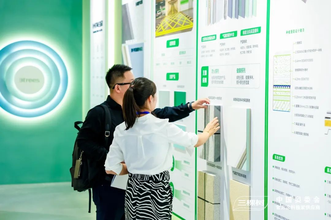 现场,三棵树室内装饰新材料吸引了众多行业内外人士的关注与讨论。展馆通过打造沉浸式体验和场景化互动充分展现工程艺术漆、小森板等室内精装产品。今年8月,三棵树与故宫宫廷文化达成战略合作,将故宫宫廷文化元素融入室内精装色彩美学与产品应用,生动展现了国漆国色的文化魅力。凭借别具匠心的展馆设计和优秀的品牌知名度,三棵树展馆吸引众多室内装饰领域参展者,并通过现场互动了解工程艺术漆易擦洗、抗菌防霉、强效净味等优势。参展者纷纷表示三棵树工程艺术漆可以完美取代墙纸、墙布等传统材料,后续会持续关注三棵树工程在室内装饰材料上的研发与推广。