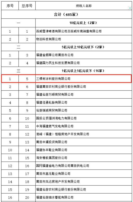 近日,莆田市2023年度纳税额500万元以上企业光荣榜发布,三棵树涂料股份有限公司位居1亿元以上5亿元以下企业光荣榜榜首。