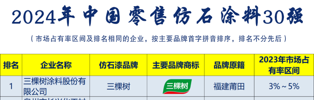 日前,涂料行业媒体《涂装新视野》发布了“2024年中国零售仿石涂料30强”榜单,三棵树一马当先,蝉联榜首。这已是三棵树连续第二年荣登“中国零售仿石涂料30强”的榜首。
