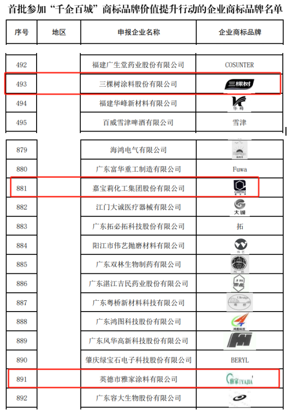 本次首批参加“千企百城”商标品牌价值提升行动名单里,其中有:三棵树涂料股份有限公司、嘉宝莉化工集团股份有限公司、英德市雅家涂料有限公司等入选企业商标品牌名单。