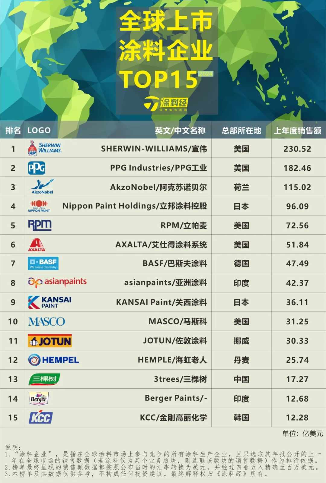 相比起去年的同类型榜单(指“2023全球涂料头部企业TOP10”,但根据当时是已经出财报的上市涂料企业延展至第13位),2024全球上市涂料企业TOP15在排名上没有发生变化,前13名依然是:宣伟、PPG工业、阿克苏诺贝尔、立邦控股、立帕麦、艾仕得涂料系统、巴斯夫、亚洲涂料、关西涂料、MASCO、佐敦涂料、海虹老人、三棵树;增加上榜的两个企业分别为印度的Berger Paints和韩国的金刚高丽化学(KCC)。