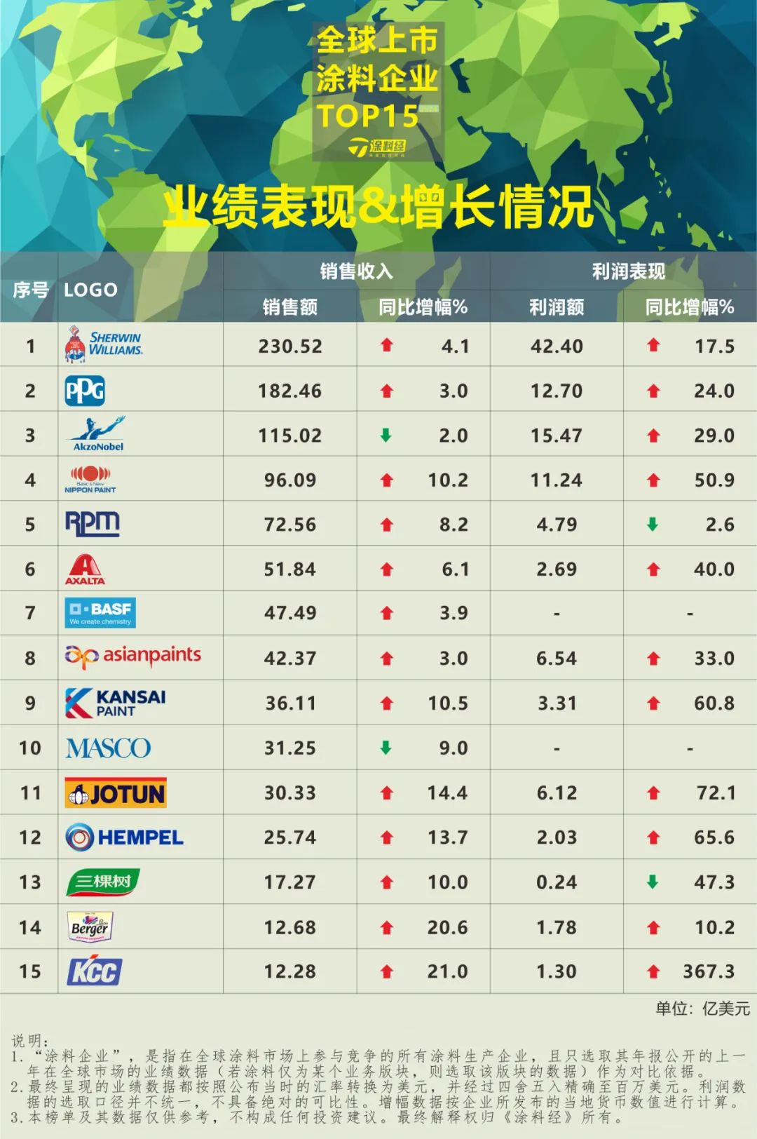 随着中国上市/挂牌涂料企业悉数披露2023年年报,以及全球大多数上市涂料企业也已经发布2023年业绩,《涂料经》团队也已进入2024年度“中国涂料头部企业TOP50”“全球涂料头部企业TOP100”榜单制作的最终阶段。按照去年的惯例,“中国涂料头部企业TOP50”将在6月初发布,而“全球涂料头部企业TOP100”则在7月初发布。