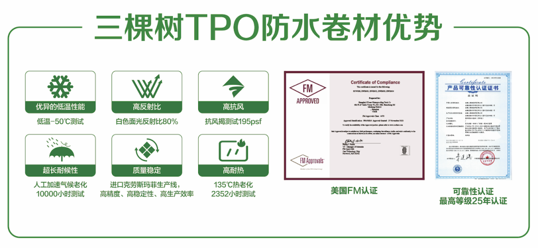 三棵树TPO防水卷材通过多个高指标检测,及高要求认证,达到国内、国际先进水平。