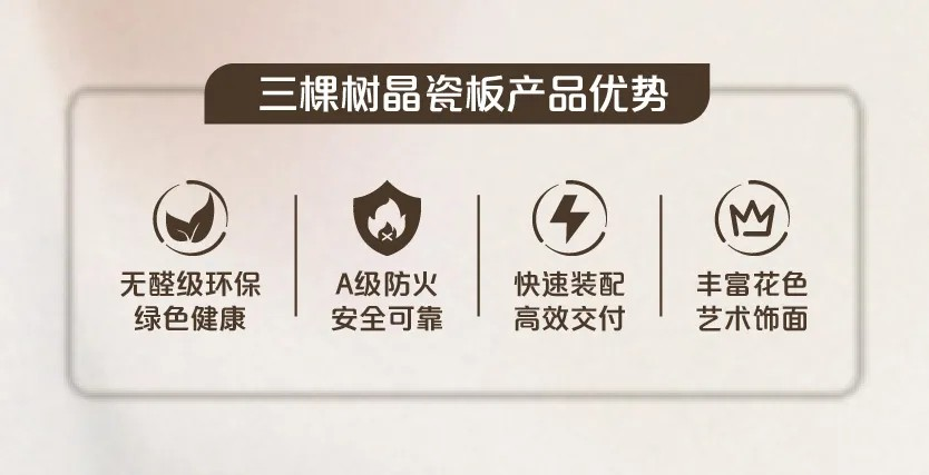 在酒店行业的应用中,三棵树工程的多款产品优势尤为突出。其中,三棵树晶瓷板采用高品质无石棉硅酸钙板为基材,运用全息数码智能饰面技术,能够高度还原天然木纹、石材、布纹等多种纹理效果,展现出丰富的美学艺术风格,这一产品不仅能够全面保障酒店室内环境质量,还大幅提升施工效率,缩短施工周期,是酒店装修领域的理想选择。