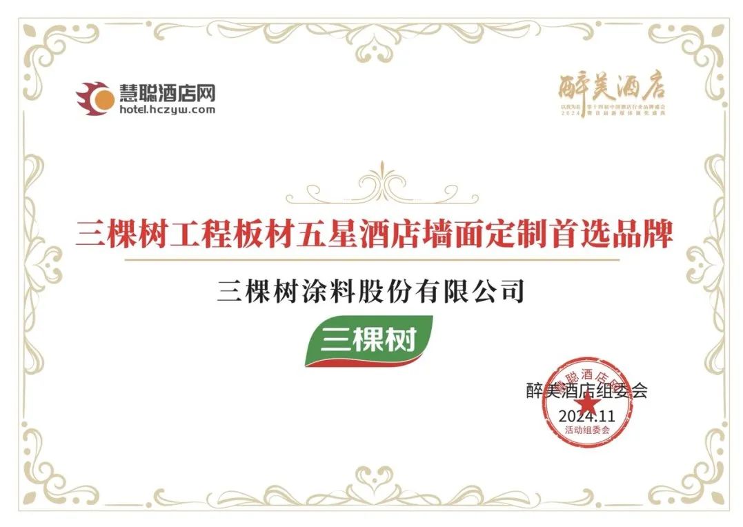 近日,“醉美酒店?以我为名”2024中国酒店行业品牌盛会圆满落幕。本次盛会汇聚了酒店行业的各方精英,围绕酒店产业链上下游协同发展,探讨行业未来趋势。三棵树凭借优异的产品品质和市场口碑,荣膺“五星酒店墙面定制首选品牌”奖项,进一步巩固了其在建筑材料领域的优势地位。