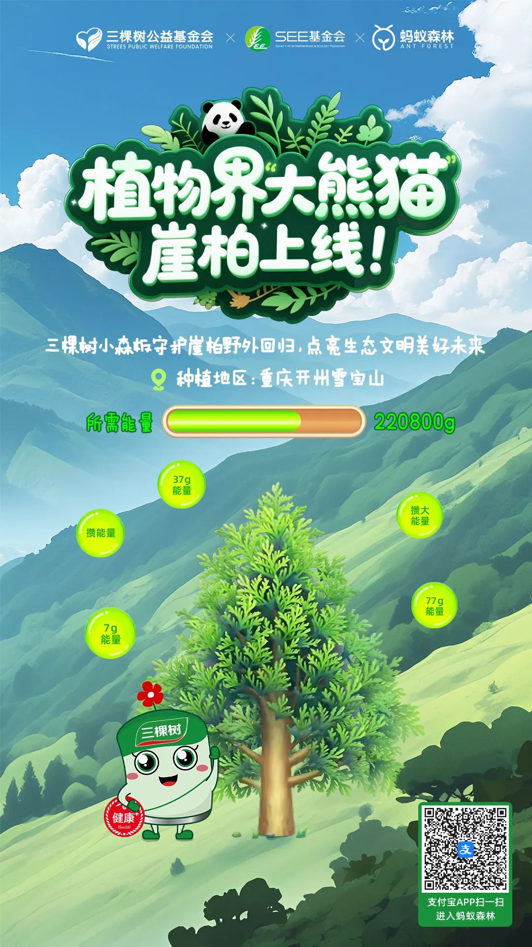 三棵树还积极拓展生态保护边界,与蚂蚁森林开展跨界合作,借助互联网力量,上线并种植百万棵梭梭树苗、槭树、桦木、崖柏等树木,动员社会力量参与生物多样性保护和生态平衡。当前,打开支付宝APP进入蚂蚁森林,捐赠22万多绿色能量,即可“云种树”一棵崖柏树苗,助力植物界“大熊猫”崖柏的野外回归。
