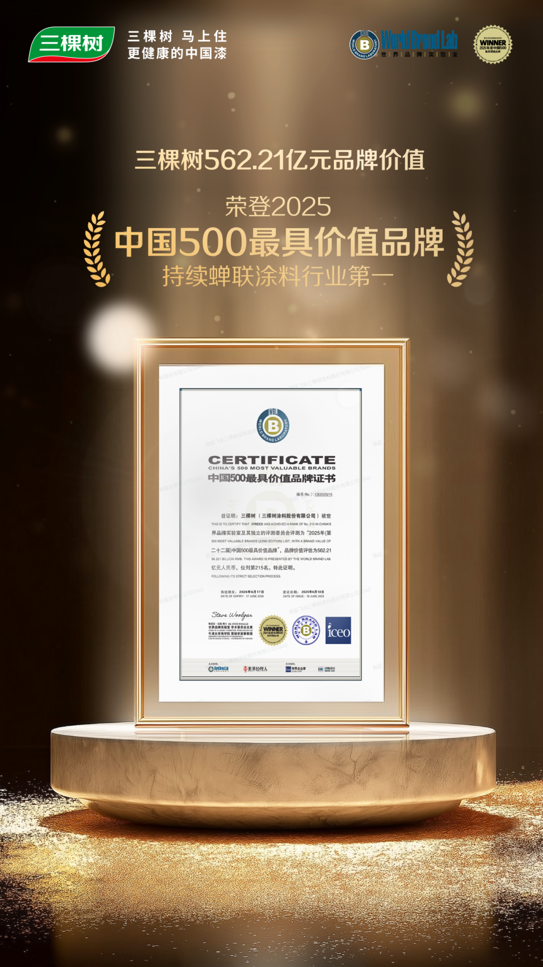6月18日,第二十二届“世界品牌大会”在京揭晓由世界品牌实验室(World Brand Lab)发布的2025年《中国500最具价值品牌》权威榜单。三棵树以562.21亿元品牌价值再度荣耀登榜,较去年增长12%,刷新历史纪录!