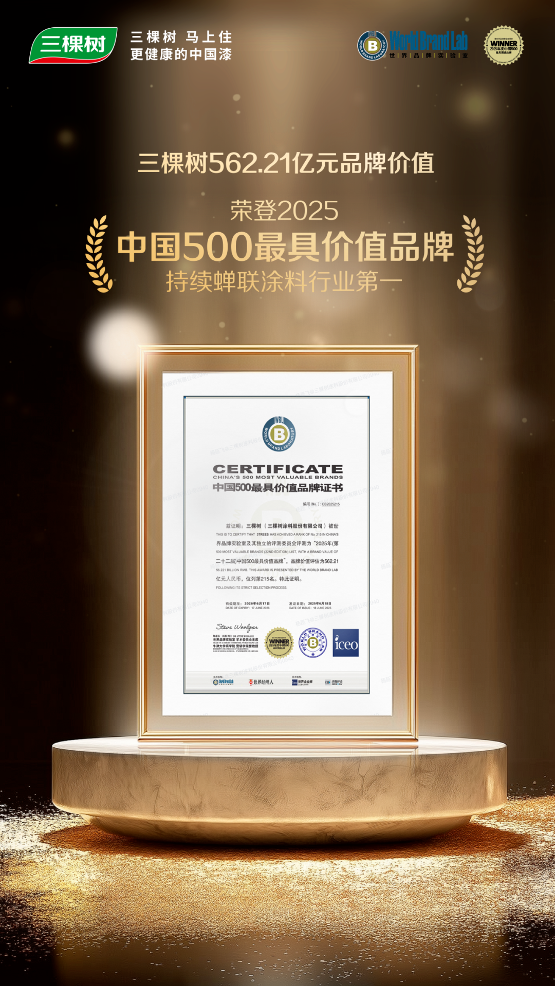 今年,三棵树以562.21亿元品牌价值再度登榜,品牌价值较去年增长12%,刷新历史纪录,而这已经是三棵树连续第19年蝉联榜单。世界品牌实验室评价指出,三棵树通过绿色创新战略持续强化品牌护城河,其“更健康的中国漆”品牌形象已然深入消费者心智。