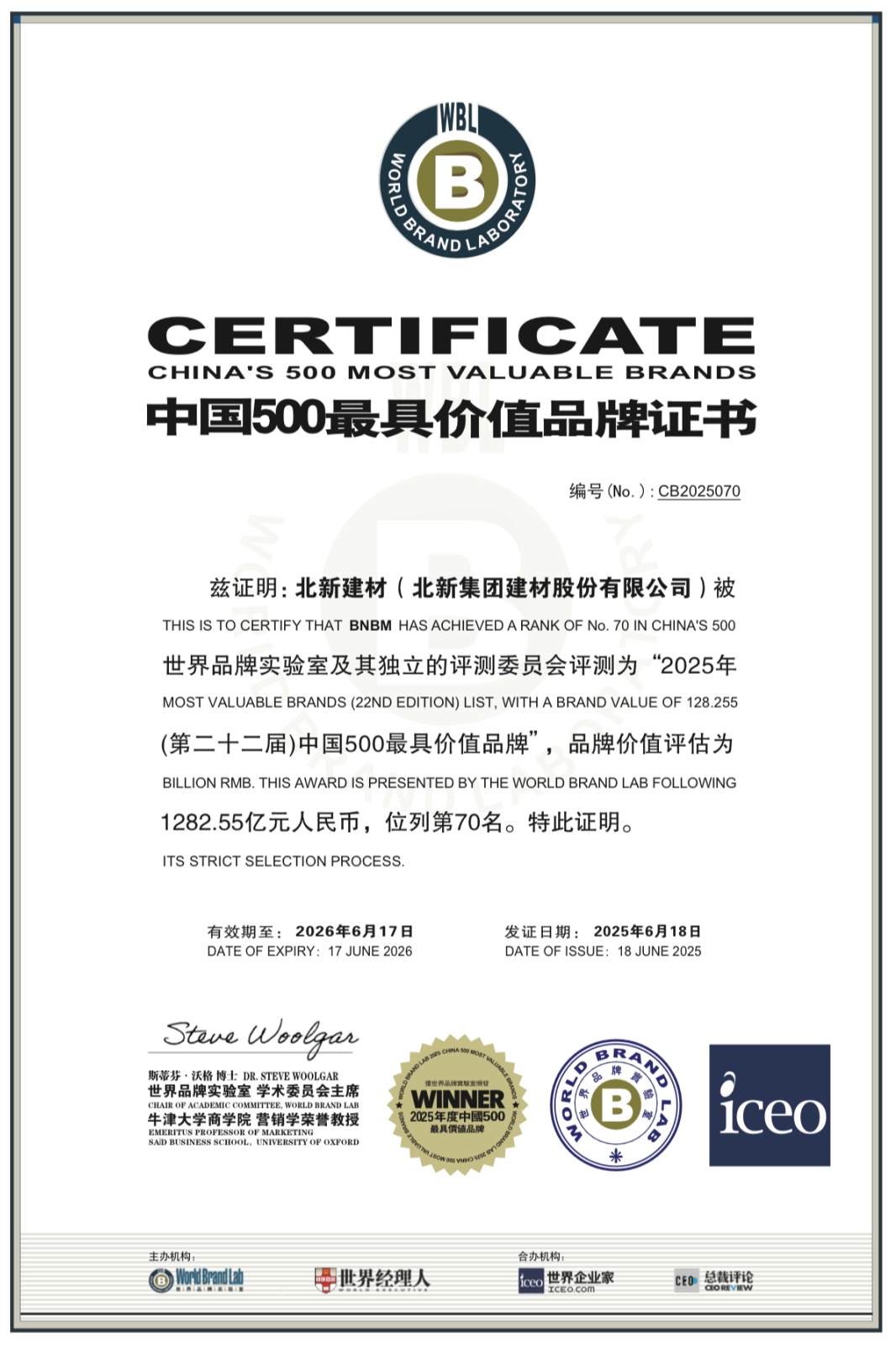 自2009年起,北新建材已连续16年上榜《中国500最具价值品牌》,今年更是以1282.55亿元的品牌价值位列榜单第70名,较去年增值96.59亿元。值得一提的是,北新建材旗下品牌北新涂料,也以82.75亿元的品牌价值,第三年入选该榜单,可谓是双喜临门。