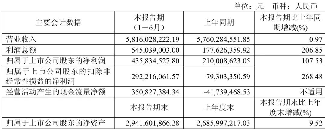 报告期内,利润总额、归母净利润和归母扣非净利润较上年同期分别同比增加,主要是本期毛利率提升、费用和计提的减值准备减少所致。报告期内,基本每股收益、稀释每股收益、扣除非经常性损益后的基本每股收益较上年同期分别增加103.45%、103.45%、263.64%,主要是本期盈利增加所致。报告期内,经营活动产生的现金流量净额为3.508亿元,较上年同期增加3.926亿元,主要是本期收回货款增加所致。