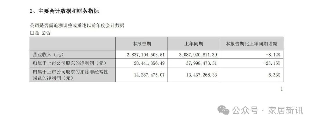 箭牌家居营收28.37亿元,同比下降8.12%;净利润为2844.14万元,同比下降25.15%