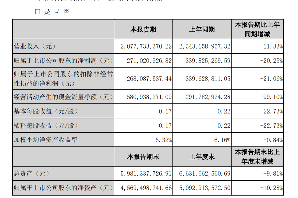 伟星新材营收20.78亿元,同比减少11.33%;净利润2.71亿元,同比减少20.25%。