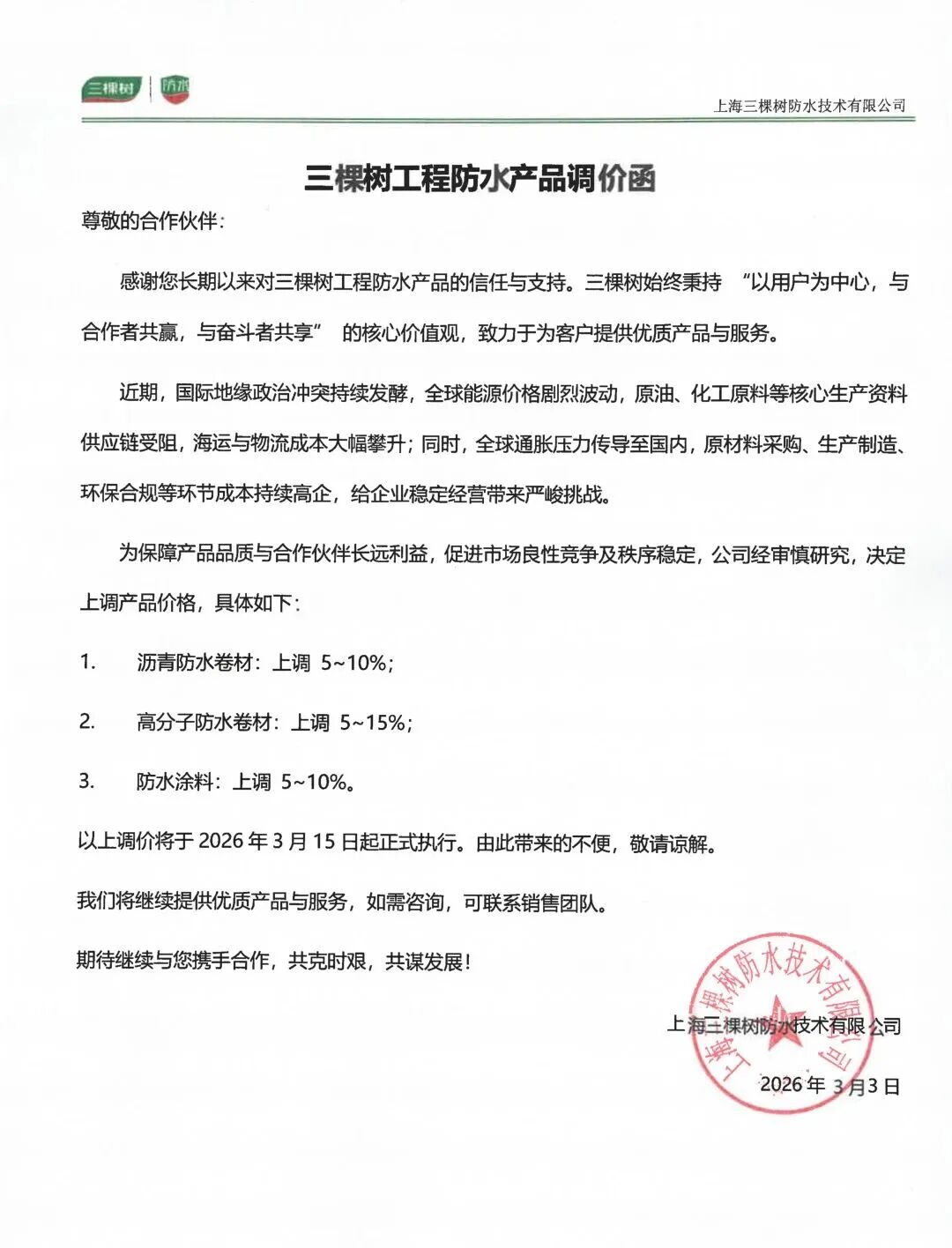 3月3日,三棵树发布工程防水产品调价函称,受近期国际地缘政治冲突影响,全球能源价格剧烈波动,原油、化工原料等核心生产资料供应链受阻,海运与物流成本大幅攀升;同时,全球通胀压力传导至国内,原材料采购、生产制造环保合规等环节成本持续高企,给企业稳定经营带来严峻挑战。为此,公司决定将沥青防水卷材、高分子防水卷材、防水涂料类产品价格统一上调5%-10%,于2026年3月15日起正式执行。