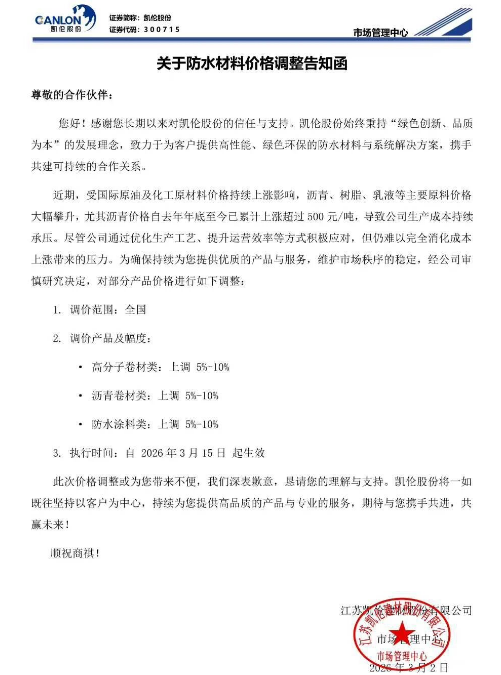 3月2日,凯伦股份在关于防水材料价格调整告知函中表示,受近期国际原油及化工原材料价格持续上涨影响,防水材料主要原料价格攀升,导致公司生产成本承压。尽管已通过优化工艺等方式积极应对,但仍难以完全消化成本压力。为此,公司决定自2026年3月15日起,在全国范围内对高分子卷材、沥青卷材、防水涂料类产品价格统一上调5%-10%。
