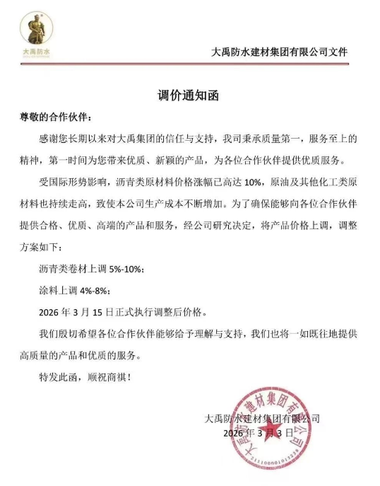 3月3日,大禹防水集团发布调价通知函称,受国际形势影响,沥青等原材料价格持续走高,为确保持续提供优质产品与服务,决定自3月15日起,将沥青类卷材价格上调5%-10%,涂料价格上调4%-8%。