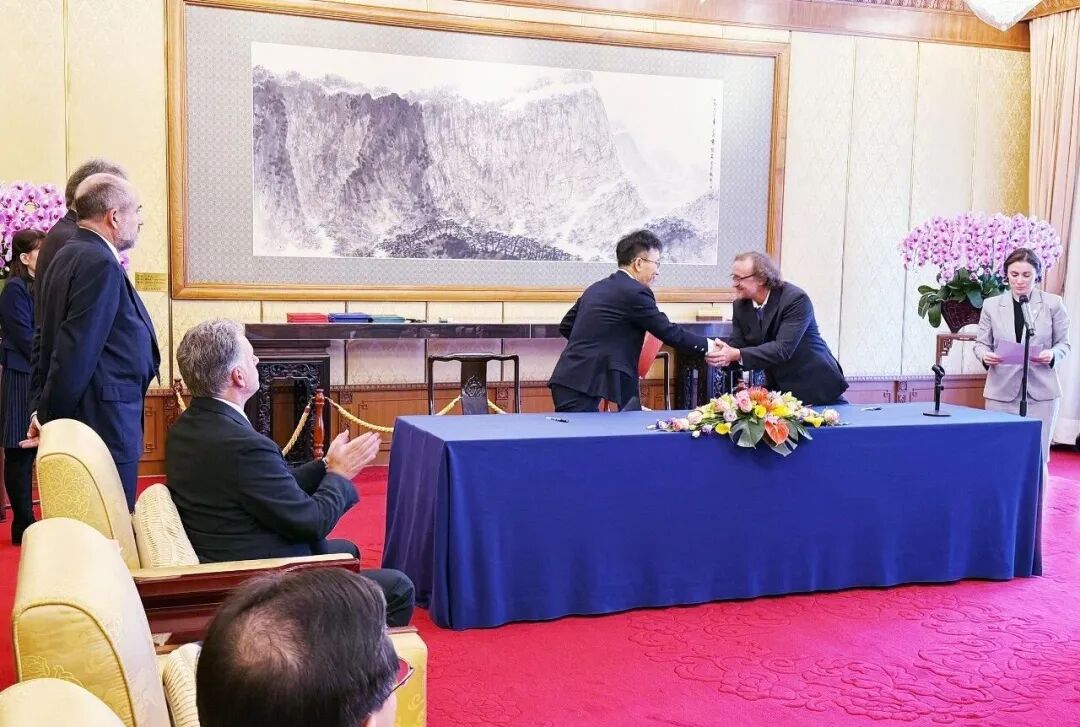 乌拉圭东岸共和国总统亚曼杜·奥尔西亲临现场,于会前接见了全体中方人员,并见证签约。