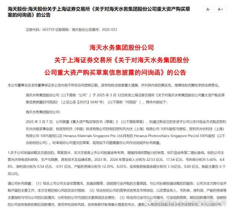 海天股份原本在其传统领域有着一定的根基与发展轨迹。它在过往的岁月中,或许凭借着自身的专业优势、市场策略等,在所属行业站稳了脚跟。然而,企业的发展往往不会满足于既有的成就与版图,跨界便成为了一些企业寻求新增长点、拓展业务边界的选择。近期,海天股份发布公告,公司拟通过全资子公司海天光伏以支付现金方式购买贺利氏光伏银浆事业部,贺利氏光伏银浆事业部包括贺利氏中国持有的贺利氏光伏 100%股权与贺利氏中国持有的对贺利氏光伏的债权、光伏科技 100%股权以及HMSL 持有的 HPSL100%股权。