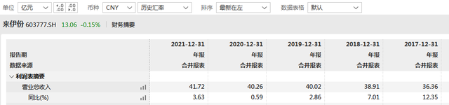 近几年,来伊份的业绩持续下行。财报显示,来伊份的营业收入连续几年处于增速下滑的状态,2017年、2018年、2019年、2020年的营业收入分别为36.36亿元、38.91亿元、40.02亿元、40.26亿元,同比增长12.35%、7.01%、2.86%、0.59%,到上年才有所好转,2021年营业收入为41.72亿元,同比增长3.63%。