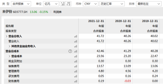 来伊份也存在着“重销售轻研发”的情况。财报显示,2019年、2020年及2021年来伊份的销售费用分别为13.06亿元、13.09亿元、13.57亿元,分别占总营收32.63%、32.52%、32.53%。而2019年、2020年及2021年来伊份的研发费用分别为0.24亿元、0.16亿元、0.05亿元,占总营收0.60%、0.39%、0.12%。