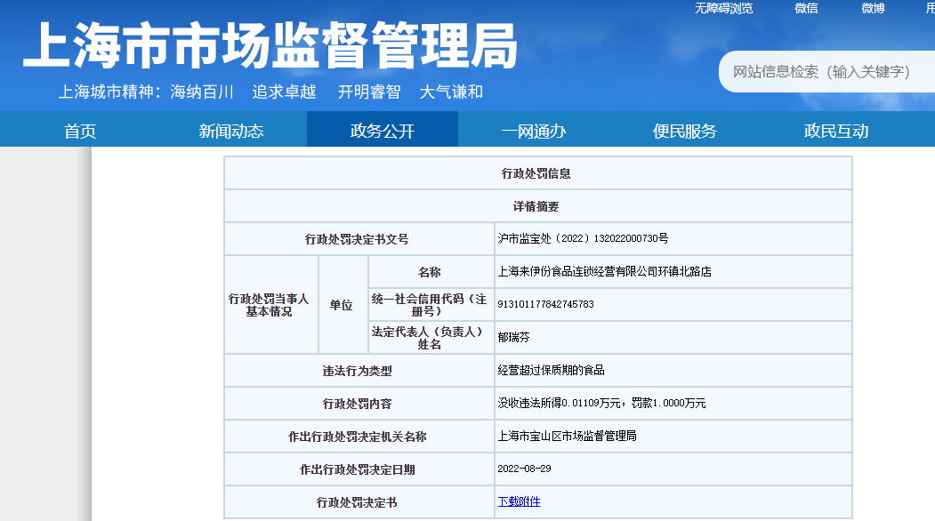 举例来看,在2022年9月7日,据 信息显示,上海来伊份食品连锁经营有限公司环镇北路店因经营超过保质期的食品,被上海市宝山区市场监督管理局罚款1万元,没收违法所得110.9元。