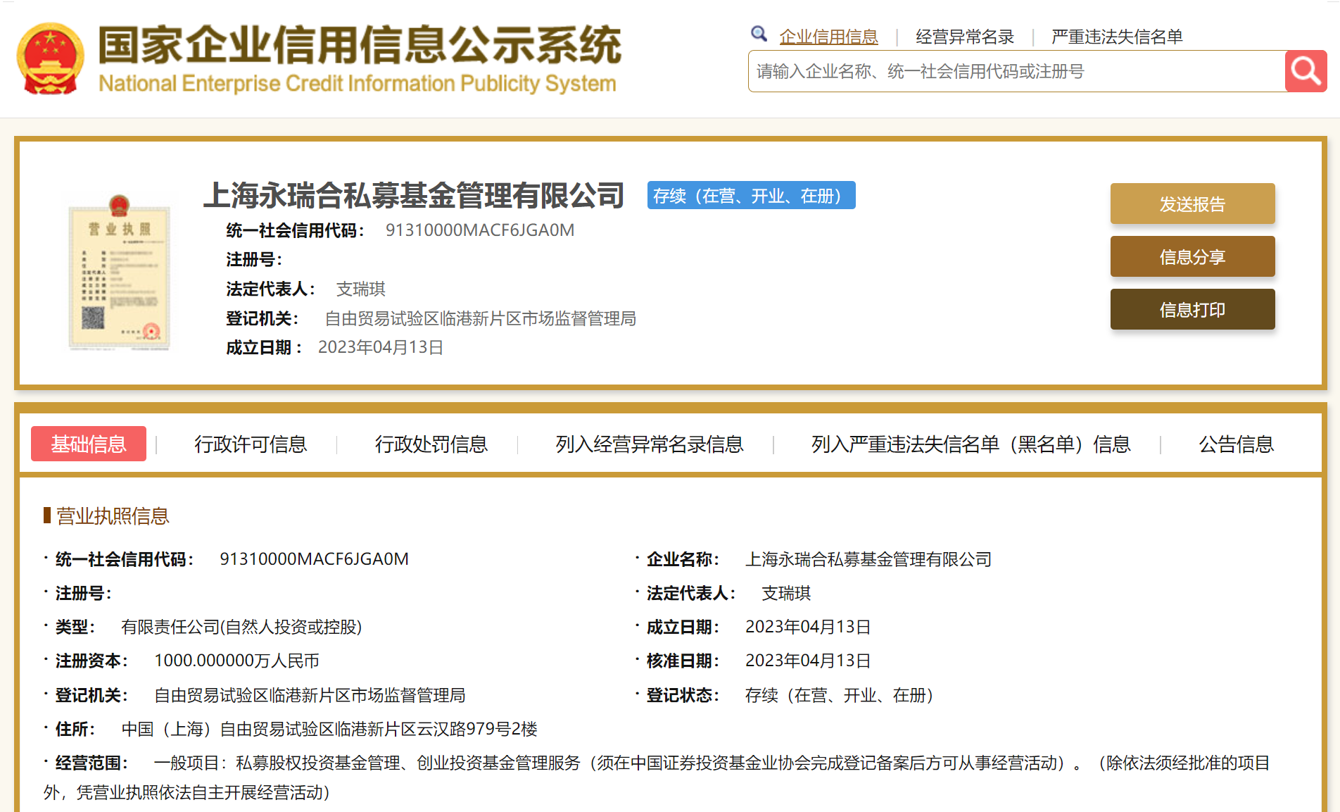 上海永瑞合私募基金管理有限公司成立于2023年4月13日,法定代表人为支瑞琪,注册资本为1000万元,经营范围为私募股权投资基金管理、创业投资基金管理服务。该公司由来伊份持股99%,上海全湃企业管理咨询合伙企业(有限合伙)持股1%。