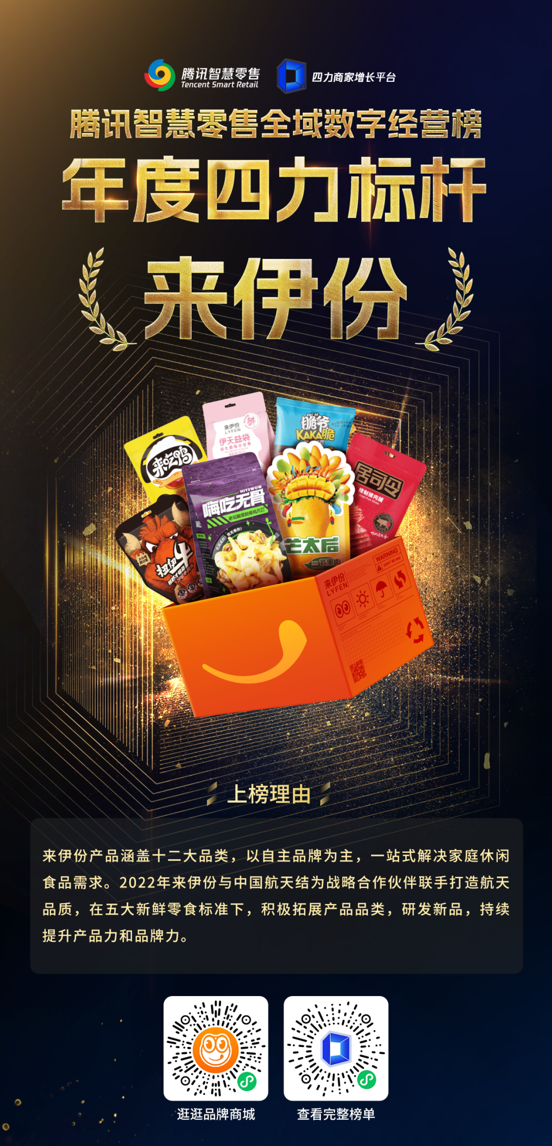 近日,由腾讯联合《哈佛商业评论》中文版及多领域专家,大中华区艾菲等头部机构联袂推荐,2022腾讯智慧零售“全域数字经营榜”发布。在这份业内首个综合衡量品牌数字经营状况的年度价值榜单中,新鲜零食来伊份凭借2022年“从私域到全域”的突出专项能力,在众多企业中脱颖而出,代表休闲食品行业与伊利、飞鹤、Bobbi Brown、巴黎欧莱雅、茶百道等知名品牌,共同摘得“年度四力标杆”荣誉。