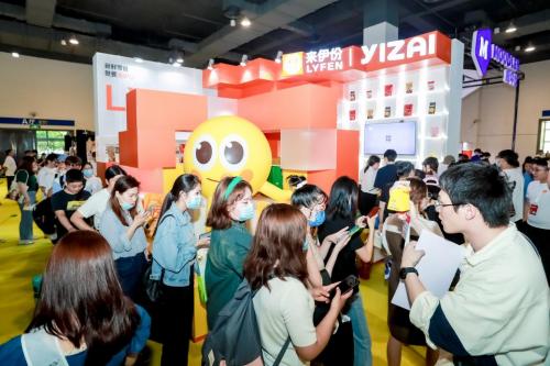 此外,展位上还展示了潮玩YIZAI及其周边产品,时令新品高粽礼盒、来咖啡,以及火出圈的TOP12大单品,如芒太后、百年好核、来吃鸭、湃湃柠等,并吸引了众多参展嘉宾驻足了解、试吃。