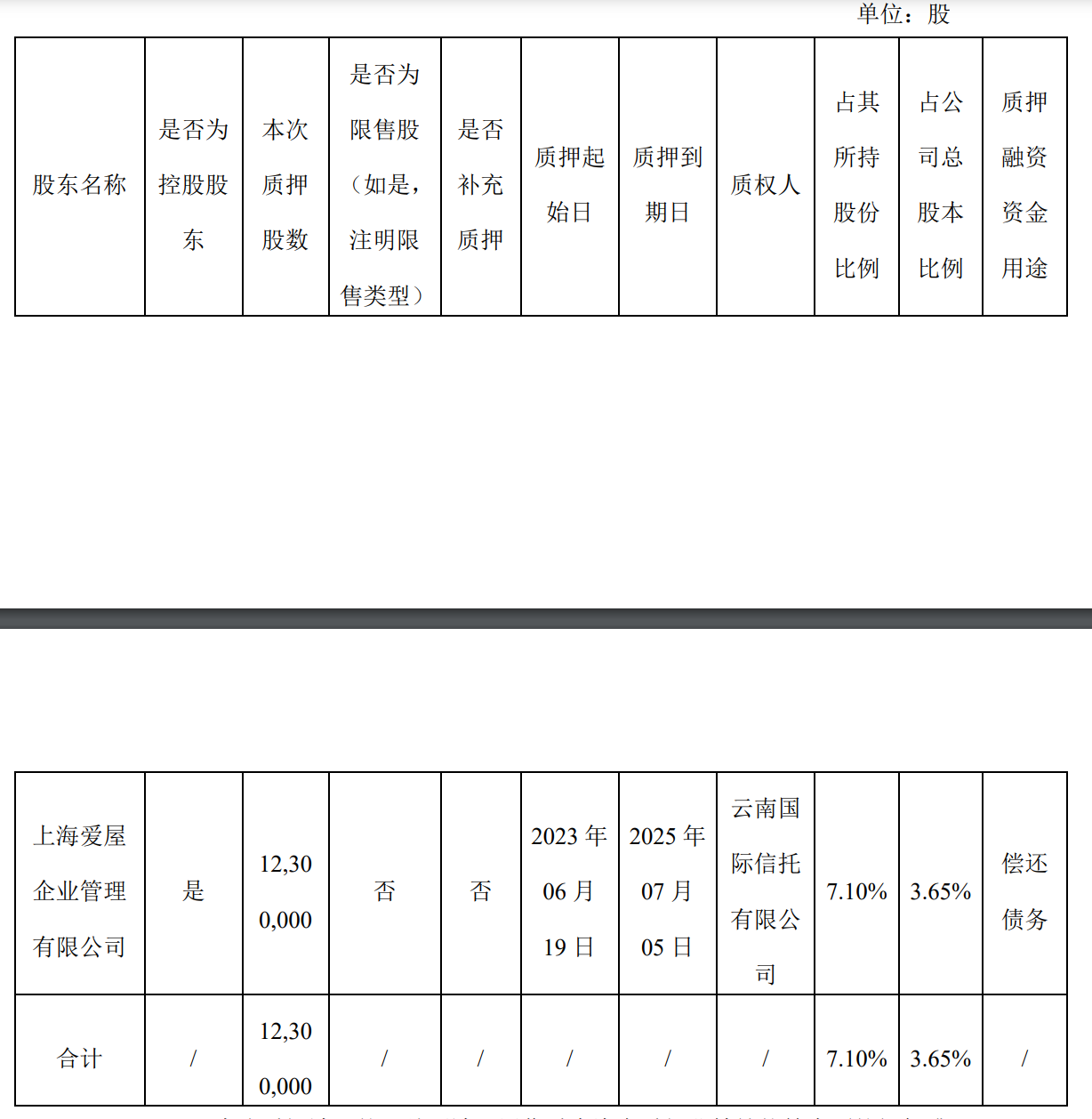 公告显示,来伊份控股股东上海爱屋企业管理有限公司(以下简称“爱屋企管”)持有公司股份173,121,200股,占公司总股本的51.44%,本次质押股份数量为12,300,000股,占来伊份总股本比例为3.65%。质押完成后,爱屋企管累计质押公司股份数量为68,140,000股,占其持股数量的39.36%,占公司总股本的20.25%。