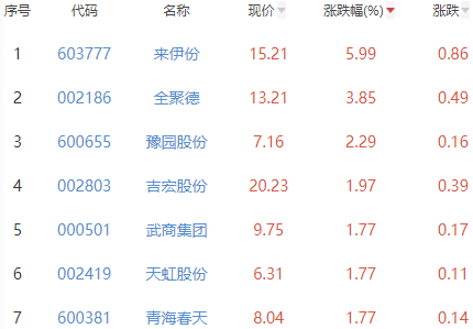 其中,来伊份、全聚德、豫园股份、吉宏股份、武商集团、天虹股份和青海春天位列板块涨幅前五位,涨幅分别为5.99%、3.85%、2.29%、1.97%、1.77%、1.77%和1.77%。