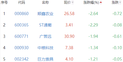 顺鑫农业、ST通葡、广誉远、中粮科技和巨力索具位列涨幅榜后五位,涨幅分别为-2.64%、-2.29%、-1.94%、-1.34%和-1.21%。