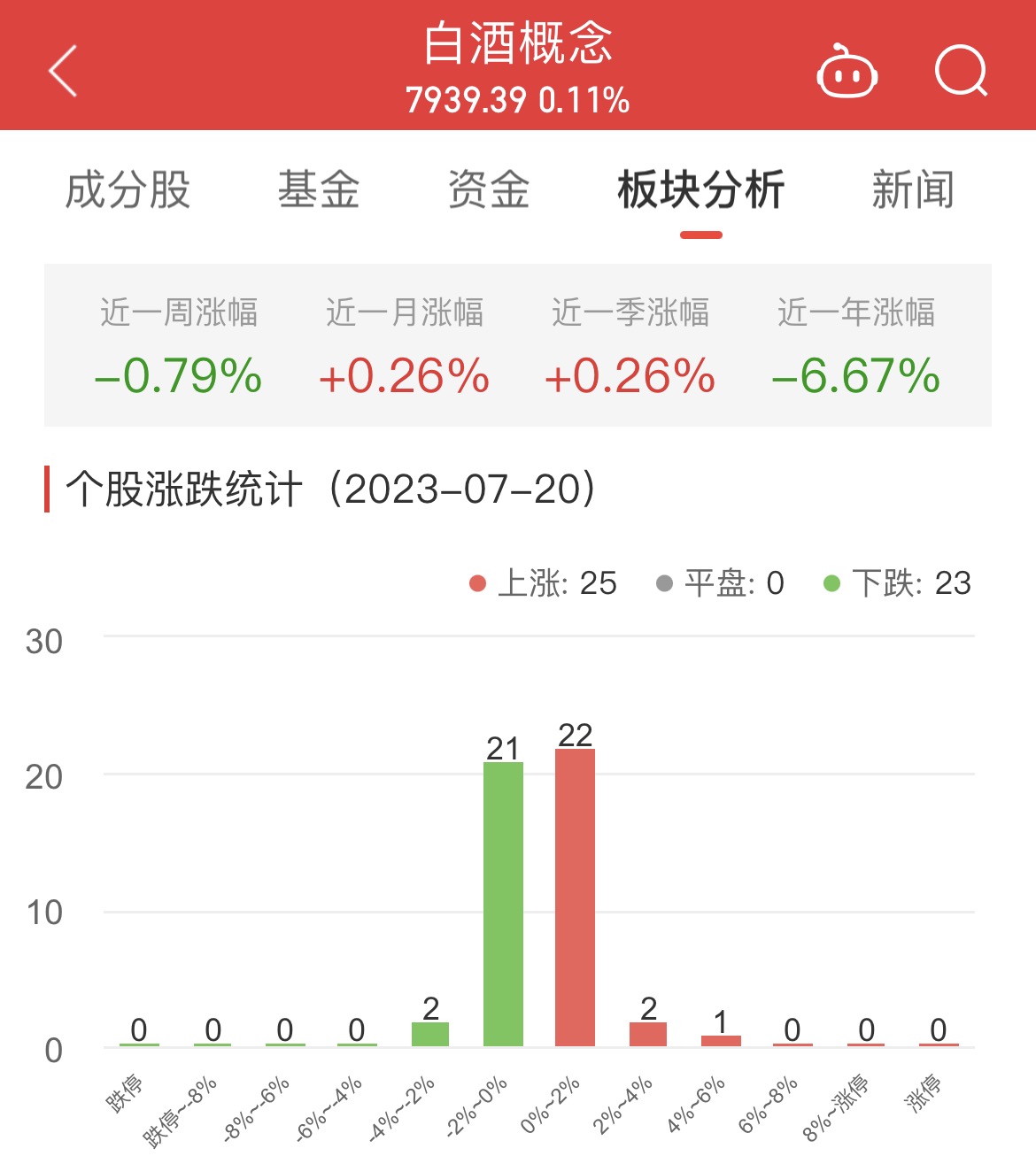 中国经济网北京7月20日讯今日,白酒概念板块整体涨幅0.11%,其中25只股票上涨,0只股票平盘,23只股票下跌。