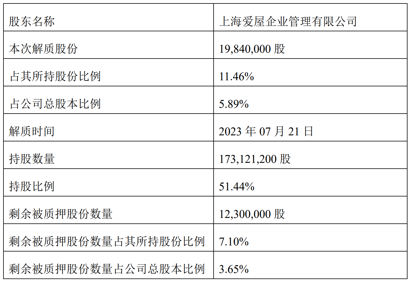 公告显示,来伊份于2023年7月24日接到公司控股股东上海爱屋企业管理有限公司(以下简称“爱屋企管”)通知,获悉爱屋企管将质押给杭州银行股份有限公司上海分行的公司股份19,840,000股(占公司总股本的5.89%)提前解除质押。