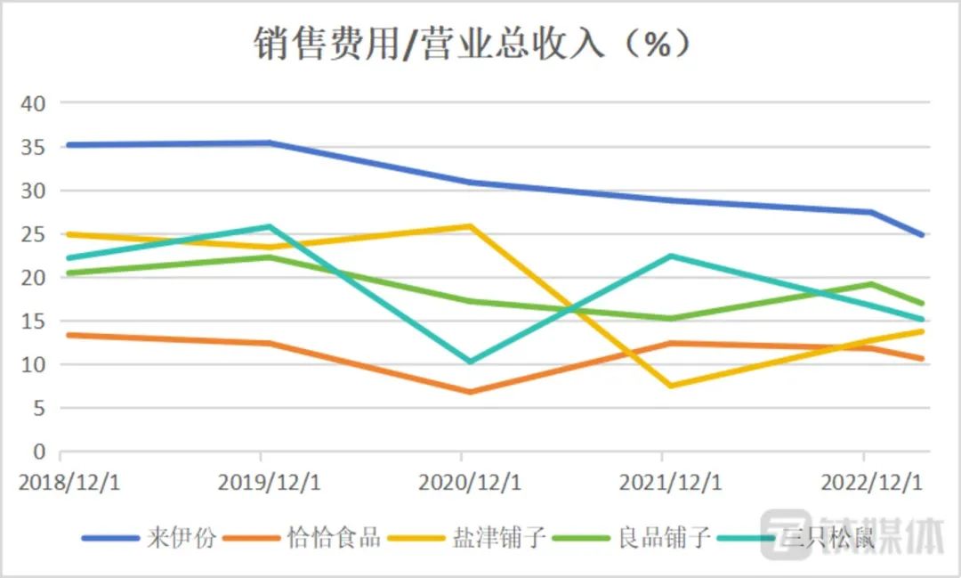 此外,来伊份2022年销售费用为12.03亿元,占总营收27.44%,明显高于洽洽食品、盐津铺子、良品铺子、三只松鼠等同行同期数据。