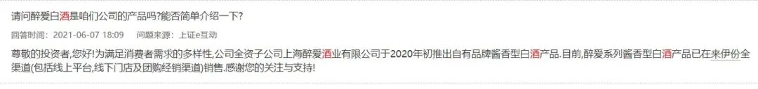 2021年6月7日,来伊份在互动平台适时透露公司已于2020年初推出自有品牌“醉爱系列”酱香型白酒产品,并在线上线下全渠道有售。