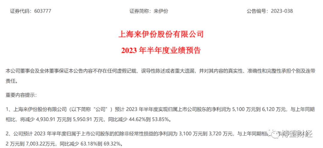 7月14日,来伊份发布半年度业绩预告,预计2023年半年度实现净利润5100万元到6120万元,同比减少44.62%到53.85%。