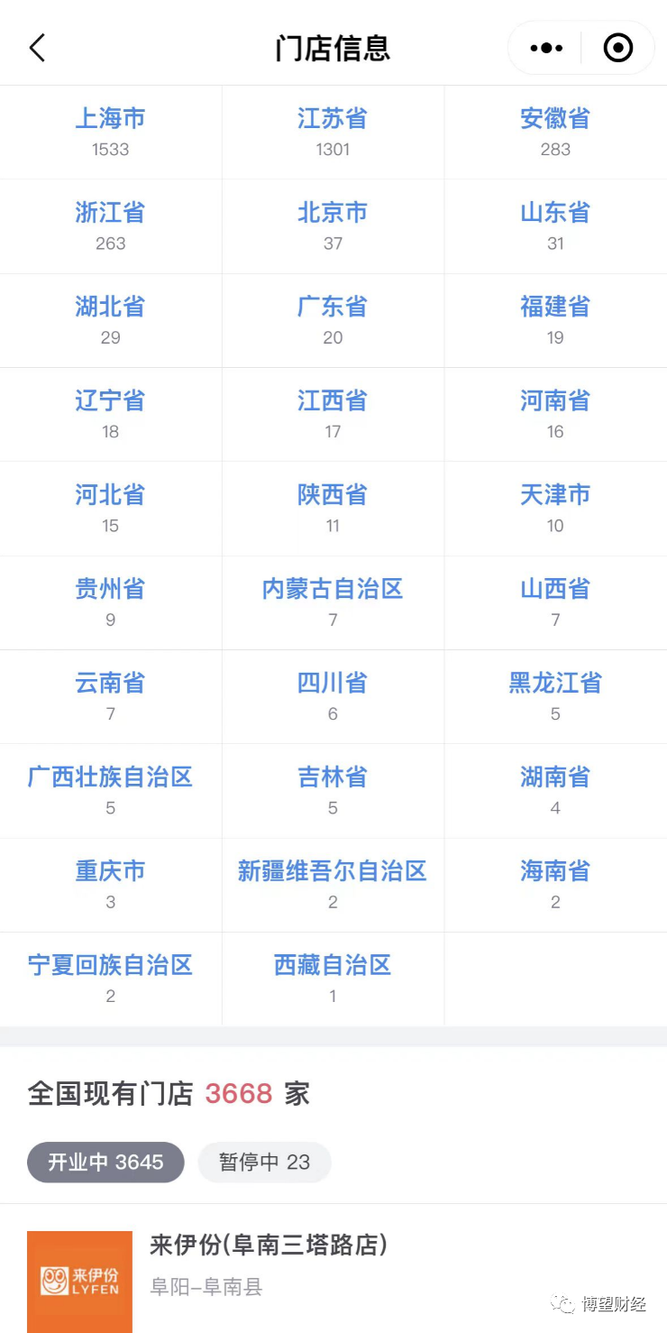 2020年至2023年8月11日,来伊份门店数量分别为3004、3488、3622、3668家。窄门餐眼最新数据显示,来伊份现有门店3668家。覆盖29个省份,153个城市。其中开业3645家,暂停中23家。