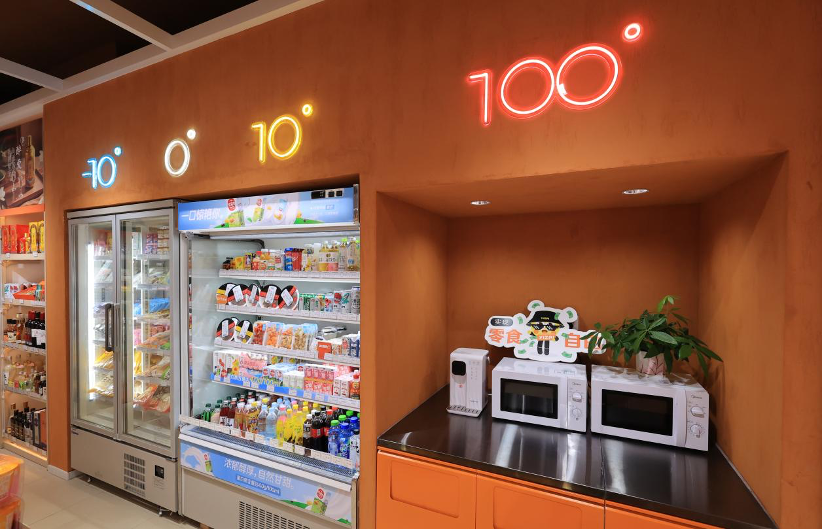 首先,是架设的不同温度带的货柜,-10℃、0℃、10℃、100℃,沿着这条温度带从冰冷的-10℃到热气腾腾的100℃,无论是喜欢冷饮亦或是热食的顾客,需求都可以得到满足。