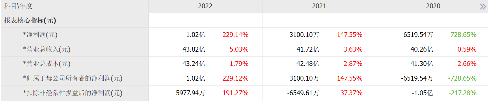 首先,复盘来伊份历年财报数据,就拿2020-2022年这三年为例,其营收分别为40.26亿元、41.72亿元、43.82亿元;归母净利润分别为-6519.54万元、3100.1万元和1.02亿元。