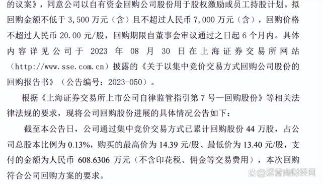 据了解,此次回购公司股份的拟回购金额为不低于3500万元且不超过7000万元。截至9月27日,公司已经通过集中竞价交易方式已经累计回购股份44万股,占公司总股本比例为0.13%,所支付的金额为608.6306万元。
