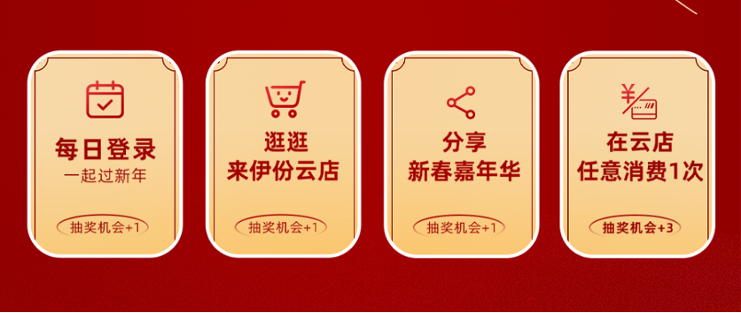 为提高用户和粉丝更深度的参与性,在来伊份的数智化技术优势加持下,“来伊份云店”小程序上线活动专区,并将释放50张新春嘉年华入场券。2023年12月25日-2024年1月5日期间,完成“每日登录”“逛逛来伊份云店”“分享新春嘉年华”“在云店任意消费1次”的四大任务,便可得到每日最高6次抽奖机会。